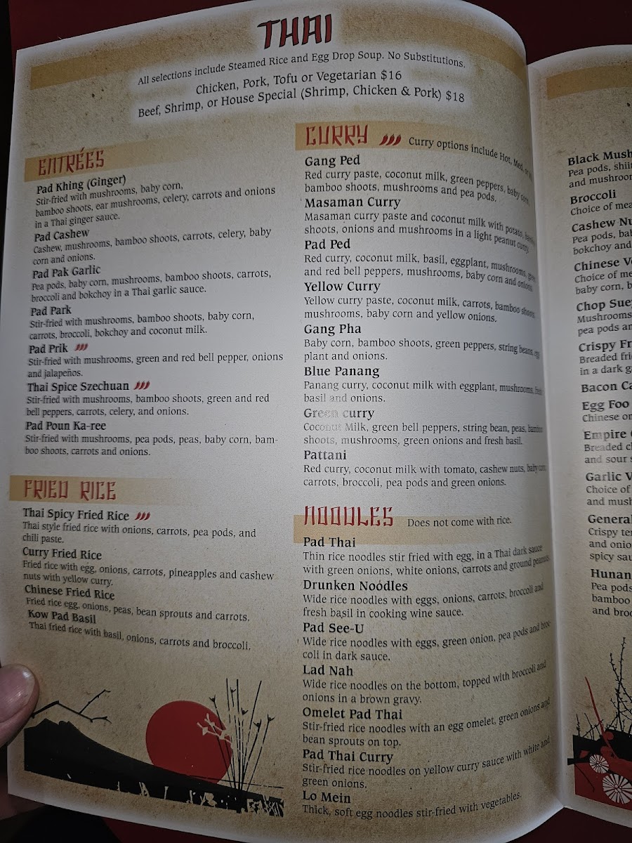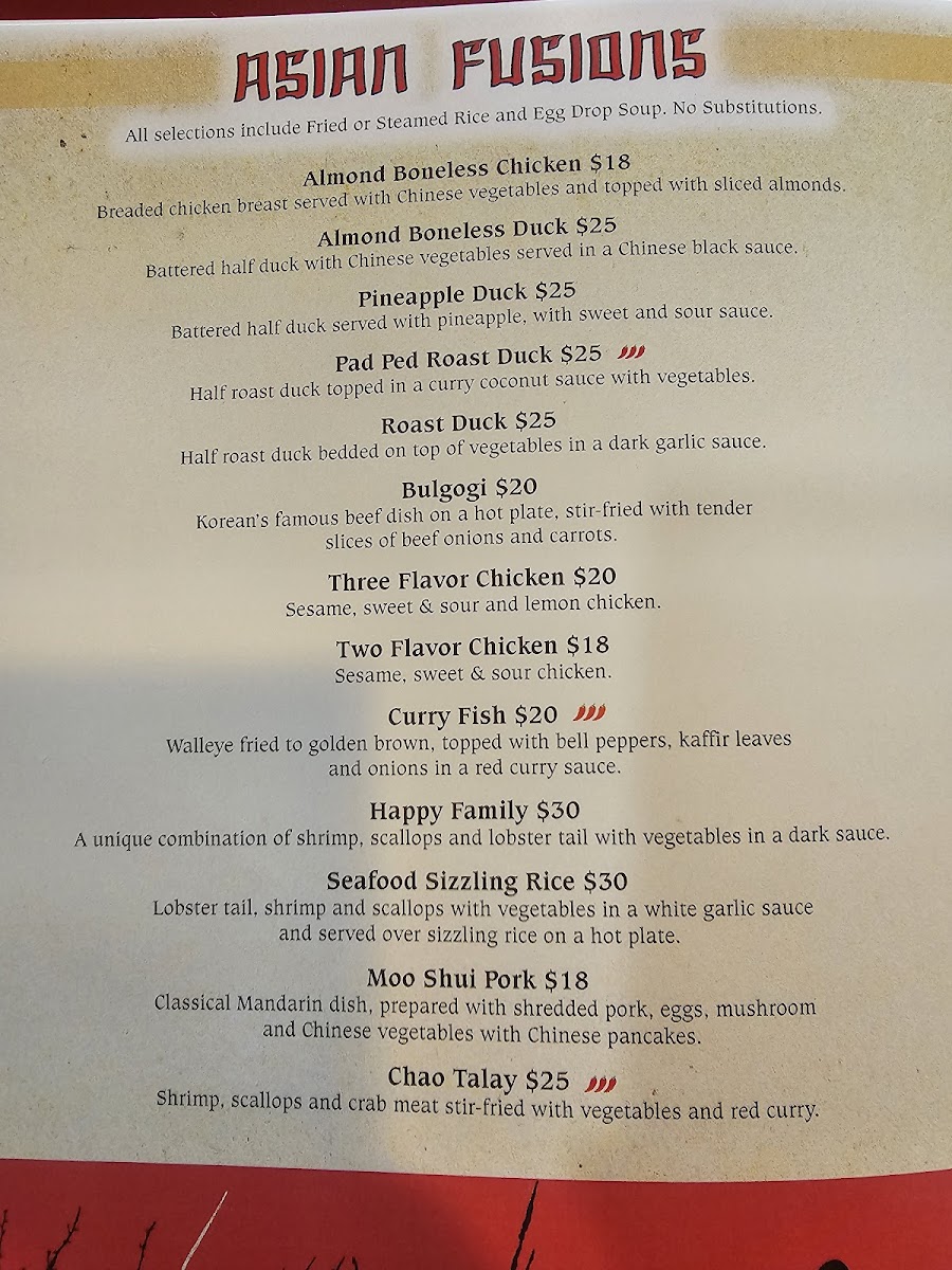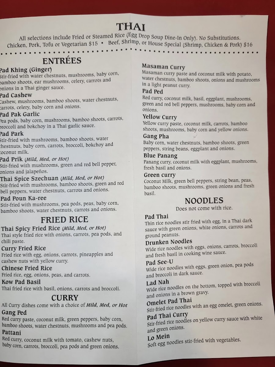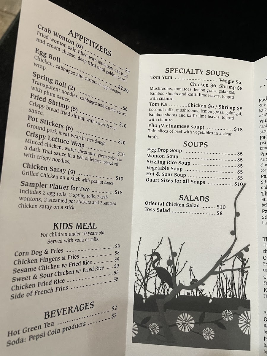 Whether you’re dining solo, sharing with family, or enjoying a quieter moment over hot tea and crab wontons, the menu caters to different moods and moments. From hearty entrees like Roast Duck with Fried Rice and Chicken Pad Thai with Basil to lighter options such as Oriental Chicken Salad or spring rolls, there’s a balance of textures and tastes to complement the unpretentious setting.